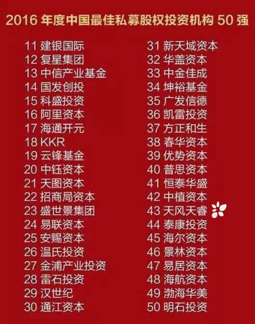 2017年1月12日,融資中國(guó)2017資本年會(huì)-股權(quán)投資峰會(huì)”在京舉辦,同時(shí)揭曉中國(guó)股權(quán)投資年度排名。天風(fēng)天睿投資股份有限公司成功入圍“2016年中國(guó)私募股權(quán)投資最佳機(jī)構(gòu)50強(qiáng)”,并憑借突出的投資能力與快速的發(fā)展榮登年度第43名。
