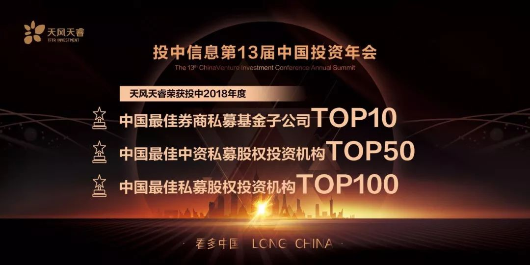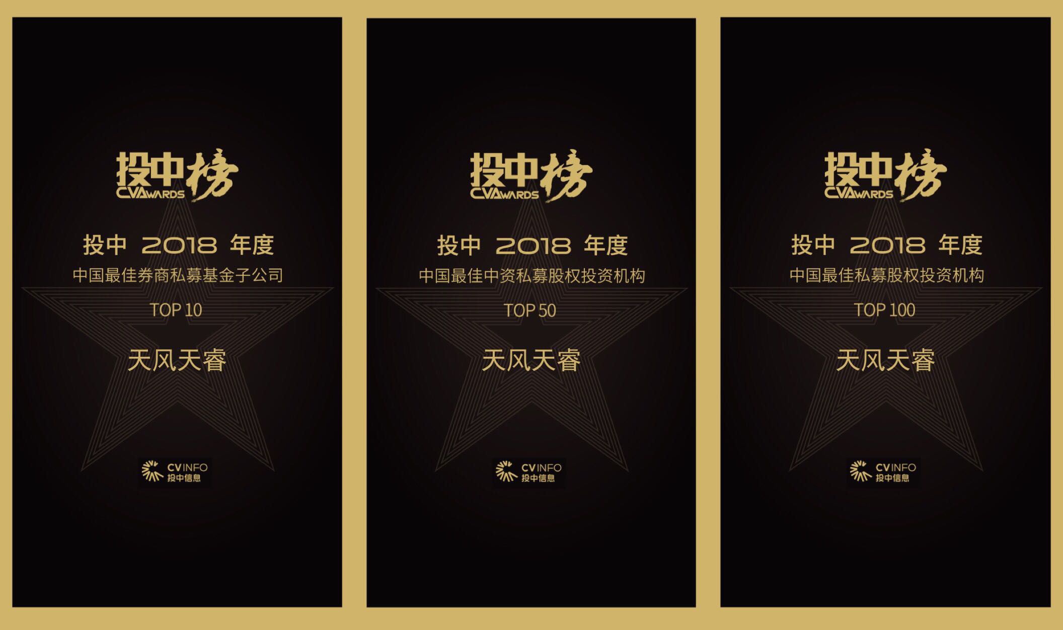 2019年4月17日,由投中信息主辦為期三天的第13屆中國投資年度峰會(huì)在上海開幕,在一年一度的“投中榜”中,天風(fēng)天睿再次上榜“2018年度中國最佳券商私募子公司TOP10”,并同時(shí)榮登“2018年度中國最佳中資私募股權(quán)投資機(jī)構(gòu)TOP50”及”2018年度中國最佳私募股權(quán)投資機(jī)構(gòu)TOP100”兩項(xiàng)重要行業(yè)榜單。這是天風(fēng)天睿自2016年起連續(xù)第三年榮獲該項(xiàng)榮譽(yù)。