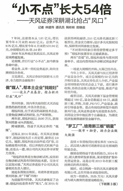 去年,頌大教育啟動新三板做市計劃,天風(fēng)證券承擔(dān)主做市商。利用行業(yè)人脈資源,引入東方證券、興業(yè)證券、光大證券入股頌大教育,聯(lián)合做市。做市激活了頌大教育股權(quán)流動性,其市值最高一度達(dá)15億元。同年,天風(fēng)證券作為主承銷商,協(xié)助頌大教育完成2.1億元的股票發(fā)行及資金募集,融資規(guī)模居當(dāng)年省內(nèi)第三位。受益的不僅僅是頌大教育。在天風(fēng)證券幫助下,博潤通、明德生物等一批優(yōu)質(zhì)企業(yè)成功登陸新三板。