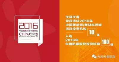 近日,“投中產(chǎn)業(yè)榜”于“2016年中國投資年會·深圳”正式揭曉,天風天睿投 資有限公司榮獲投中產(chǎn)業(yè)榜“投中-2016年度中國新能源與清潔技術產(chǎn)業(yè)最佳新銳投資機構(gòu)”獎項。