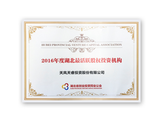 天風(fēng)天睿投資股份有限公司榮獲“2016年度湖北最活躍股權(quán)投資機(jī)構(gòu)”