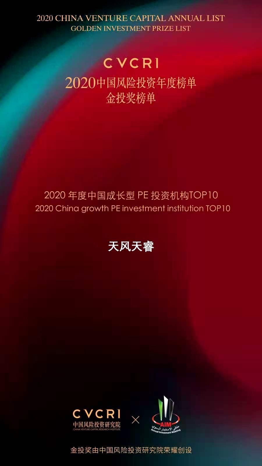 12月11日,“2020中國風險投資年度榜單•金投獎榜單”正式揭曉,本次榜單由中國風險投資研究院創(chuàng)設(shè),聯(lián)合阿聯(lián)酋迪拜國際投資年會AIM共同發(fā)布。天風天睿作為一家成立七年的私募股權(quán)投資機構(gòu),憑借其發(fā)展勢能和成長潛力,再次上榜“中國成長型PE投資機構(gòu)TOP10”。